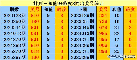 上期总结:胪列三第2025287期奖号:180。和值9,跨度8。