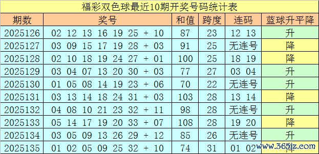 上期开奖:福彩双色球第2025135奖号开出:01 02 05 09 25 32 + 10,红球号码和值为74,首尾间距为31,包含连号:01 02。