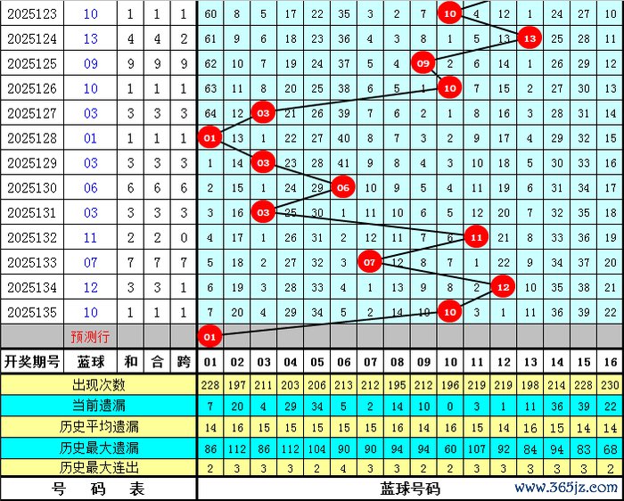 蓝球分析:上期蓝球开出号码10,下落2个点位,最近10期蓝球号码升平降分歧为:升、降、降、升、升、降、升、降、升、降,本期看好蓝球下落,独蓝参考01。