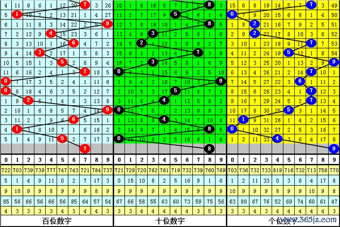 3、在以上0-9号码频次中,号码大小比为32:33,012路比为27:19:19,本期预测百位开出1路号码,参考号码7。