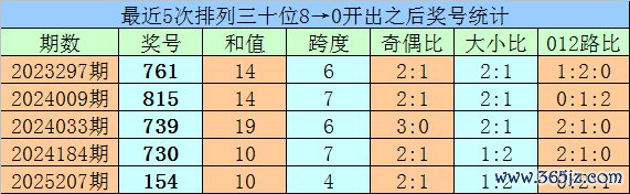 1、最近两期成列三十位号码开出号码永别为8和0,历史上十位号码伙同两期同期出现号码8和0的奖号共开出68期。最近五次下期开出号码为:761、815、739、730、154;